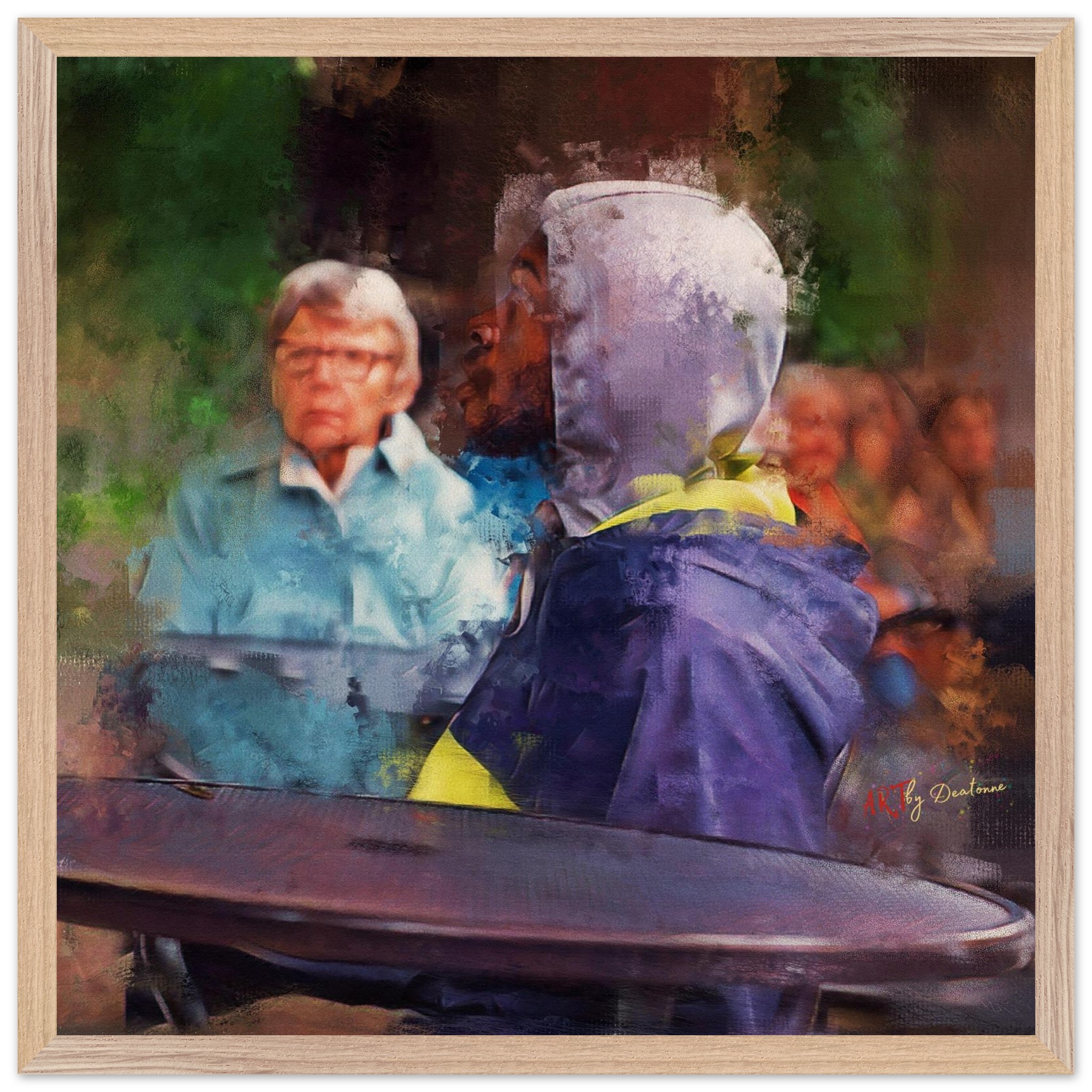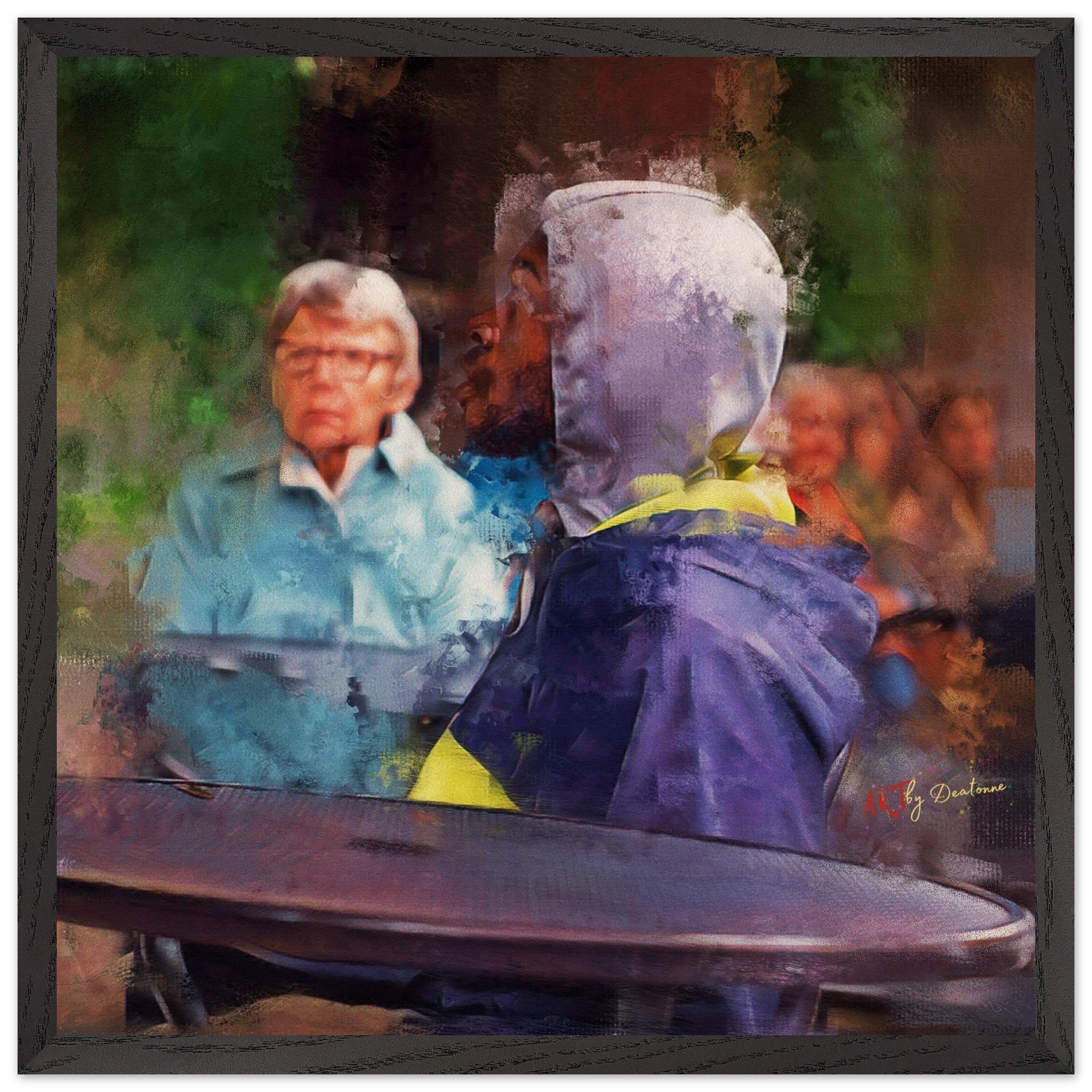 The Subject: The piece centers on a stark juxtaposition between an elderly white man and a young Black woman. Though they are physically aligned—his gaze directed squarely toward her—there is a profound psychological distance.