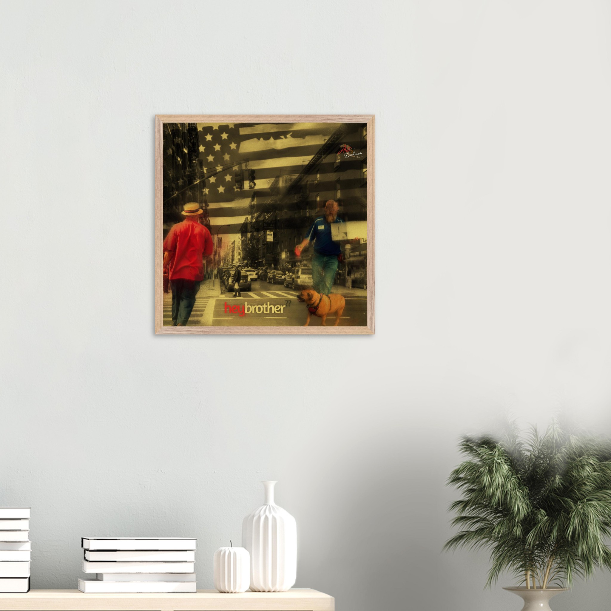 “Hey Brother” is a poignant urban snapshot that captures a fleeting yet profound moment of connection amidst the rush of city life. The composition centers on a white man mid-stride as he navigates a bustling, sun-drenched metropolitan intersection, his hand firmly gripping the leash of his Bulldog.