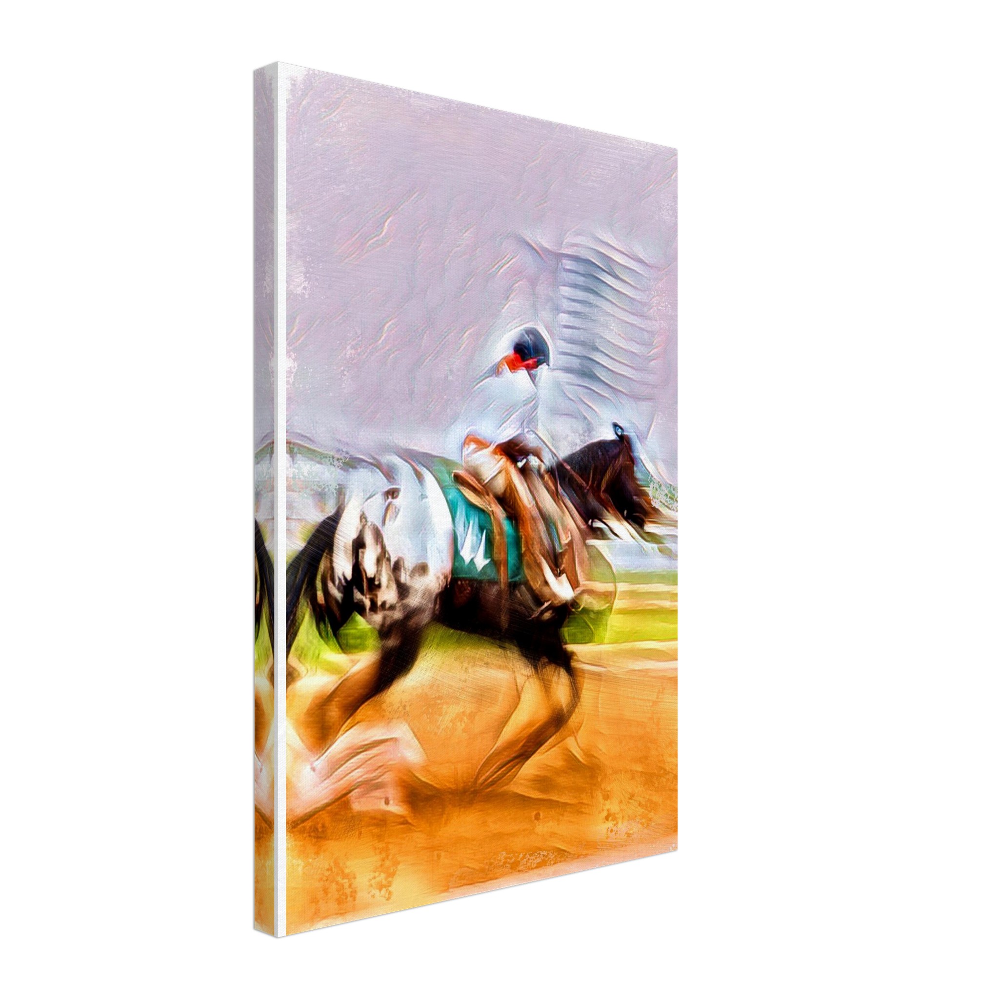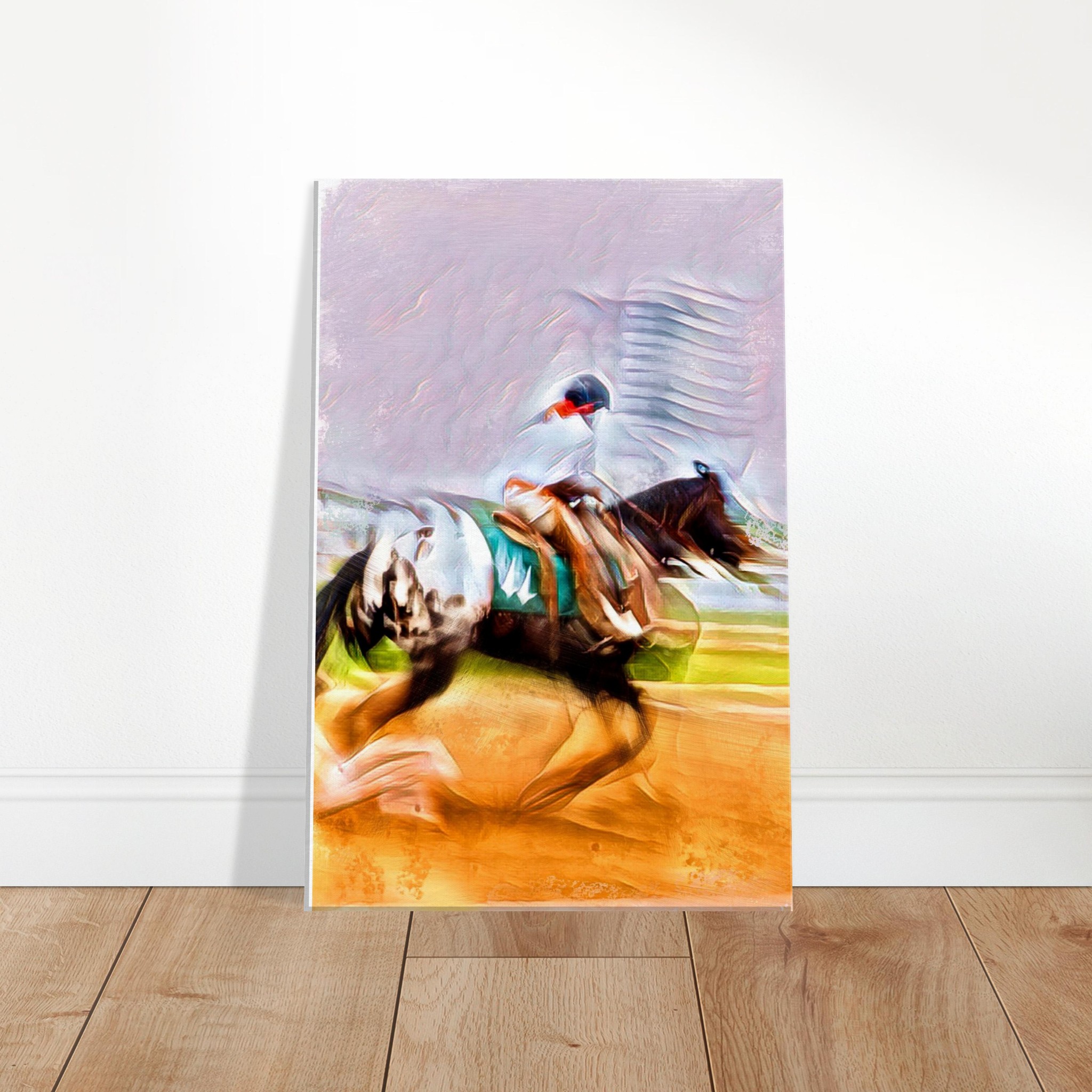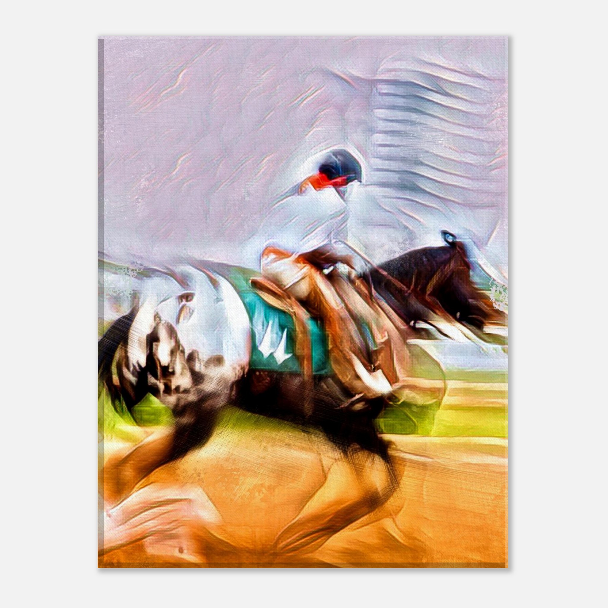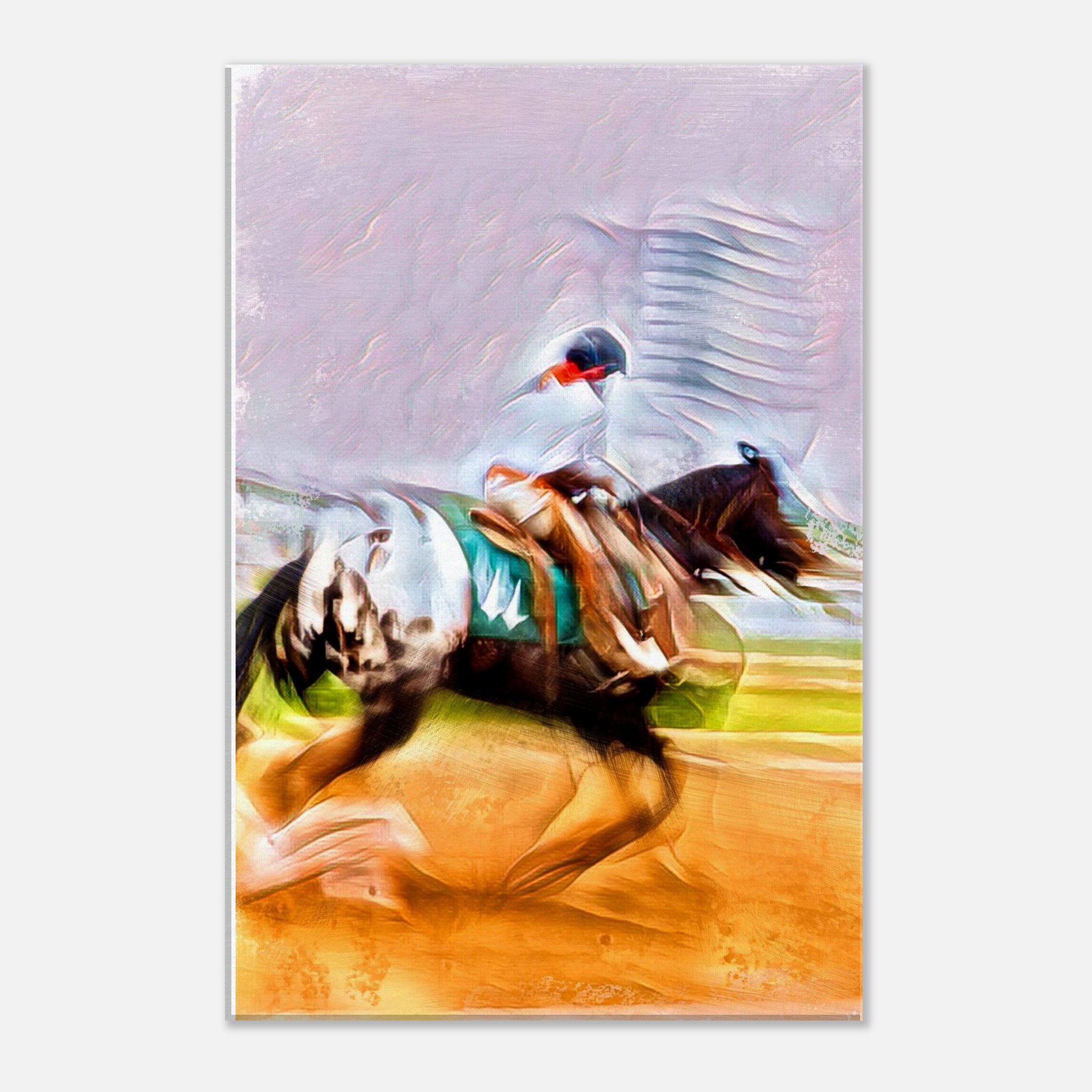Rider features an impressionistic look of a high-energy close-up that focuses on the intensity of the jockey and the powerful muscularity of the horse in full stride. Brilliant colors and a vibrant palette.