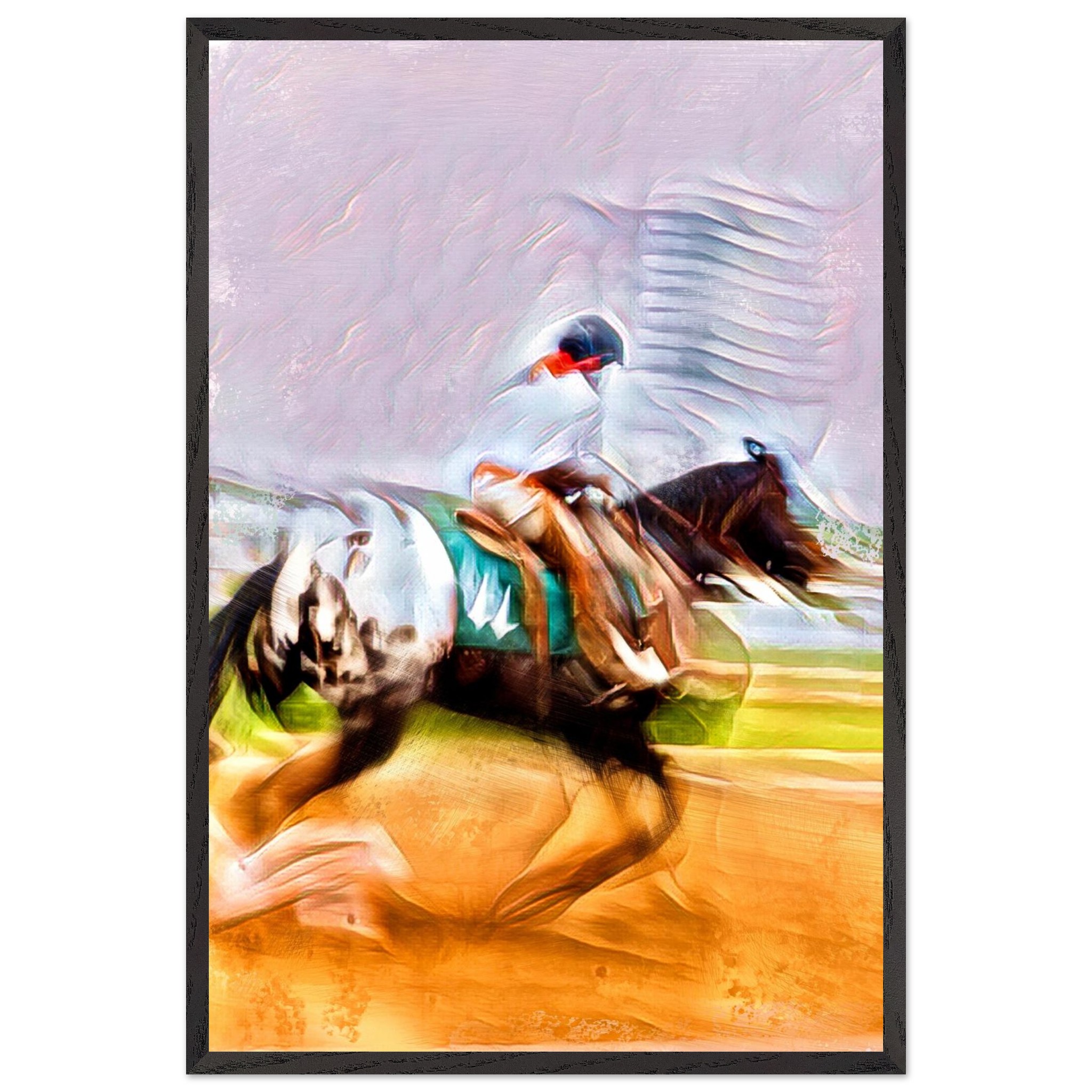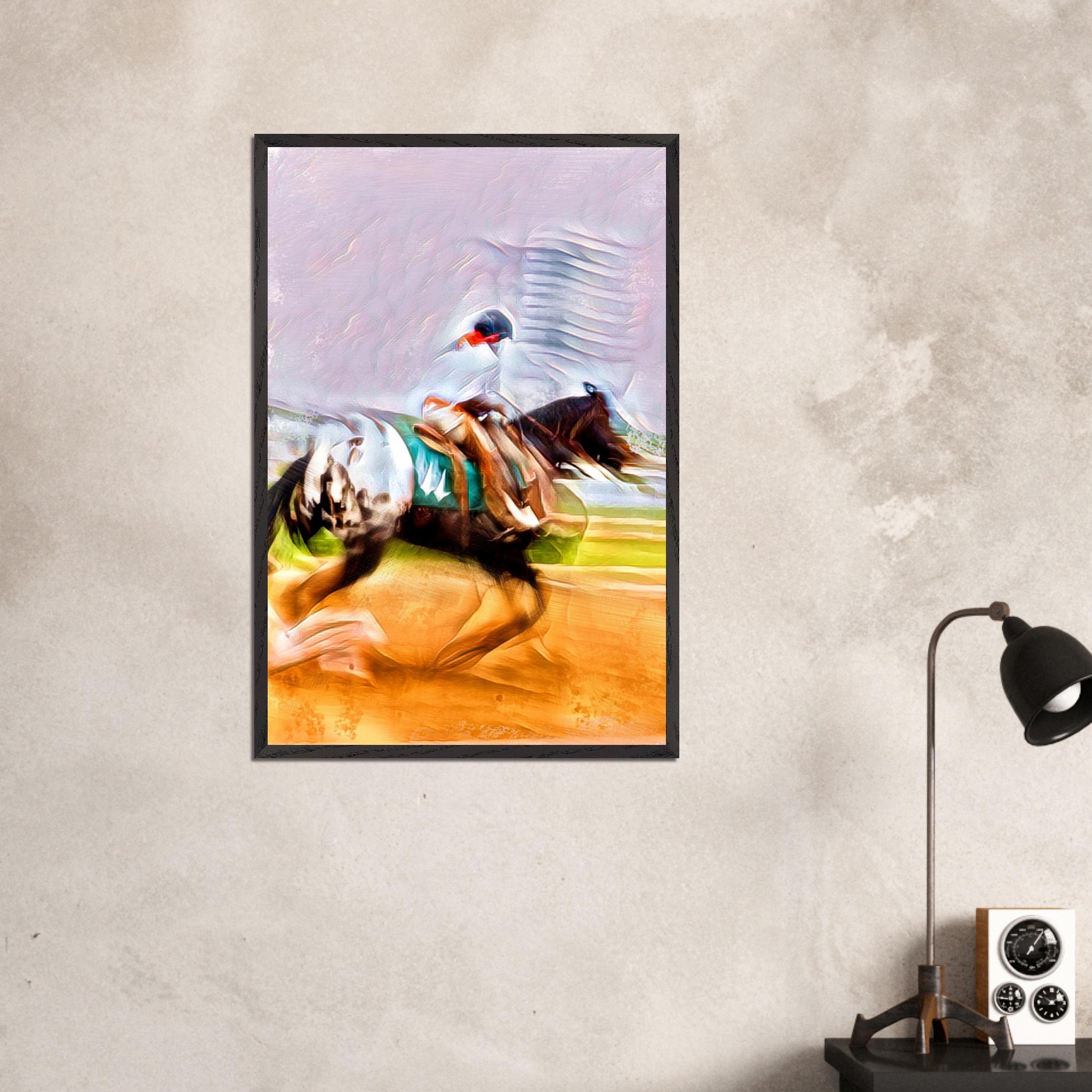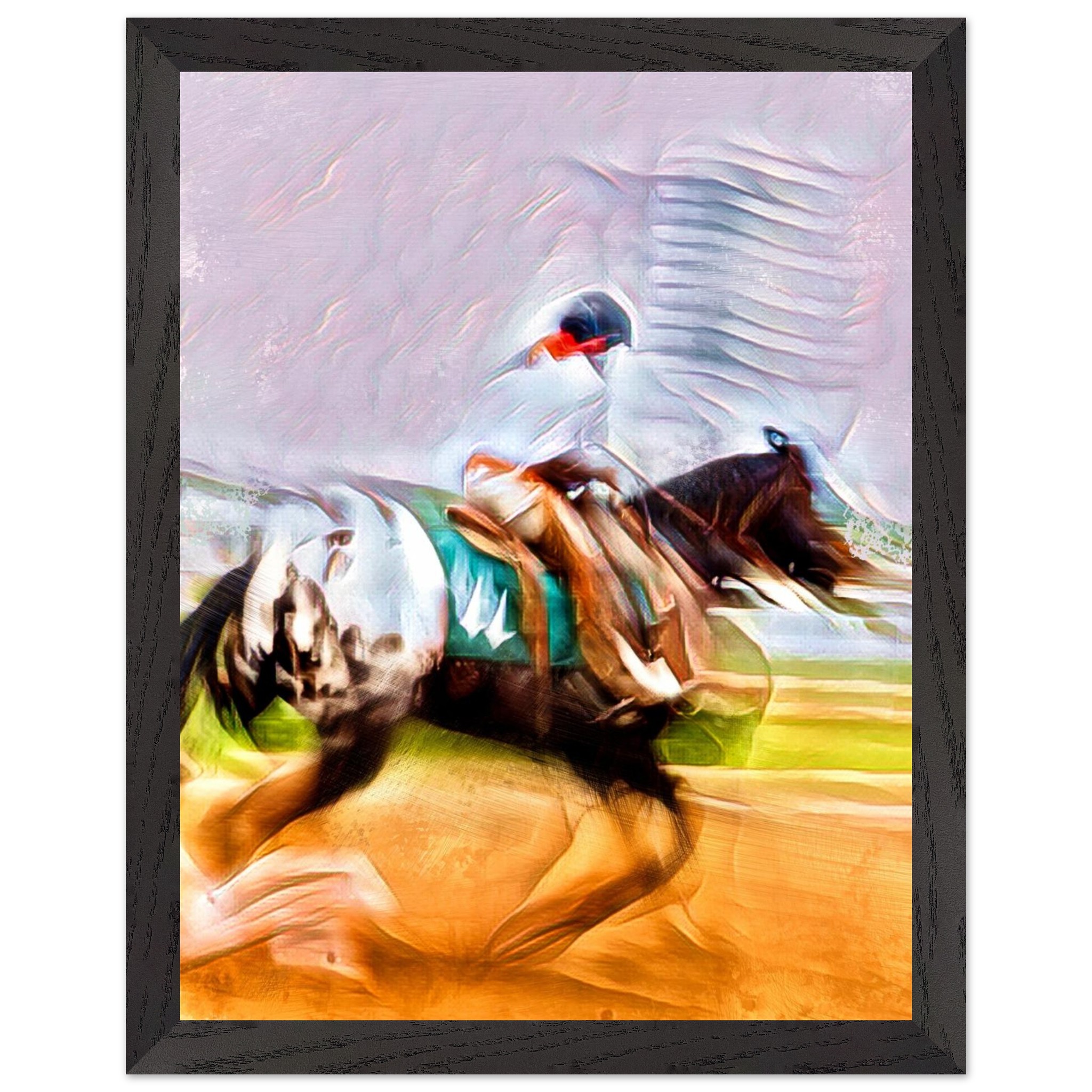 Rider features an impressionistic look of a high-energy close-up that focuses on the intensity of the jockey and the powerful muscularity of the horse in full stride. Brilliant colors and a vibrant palette.