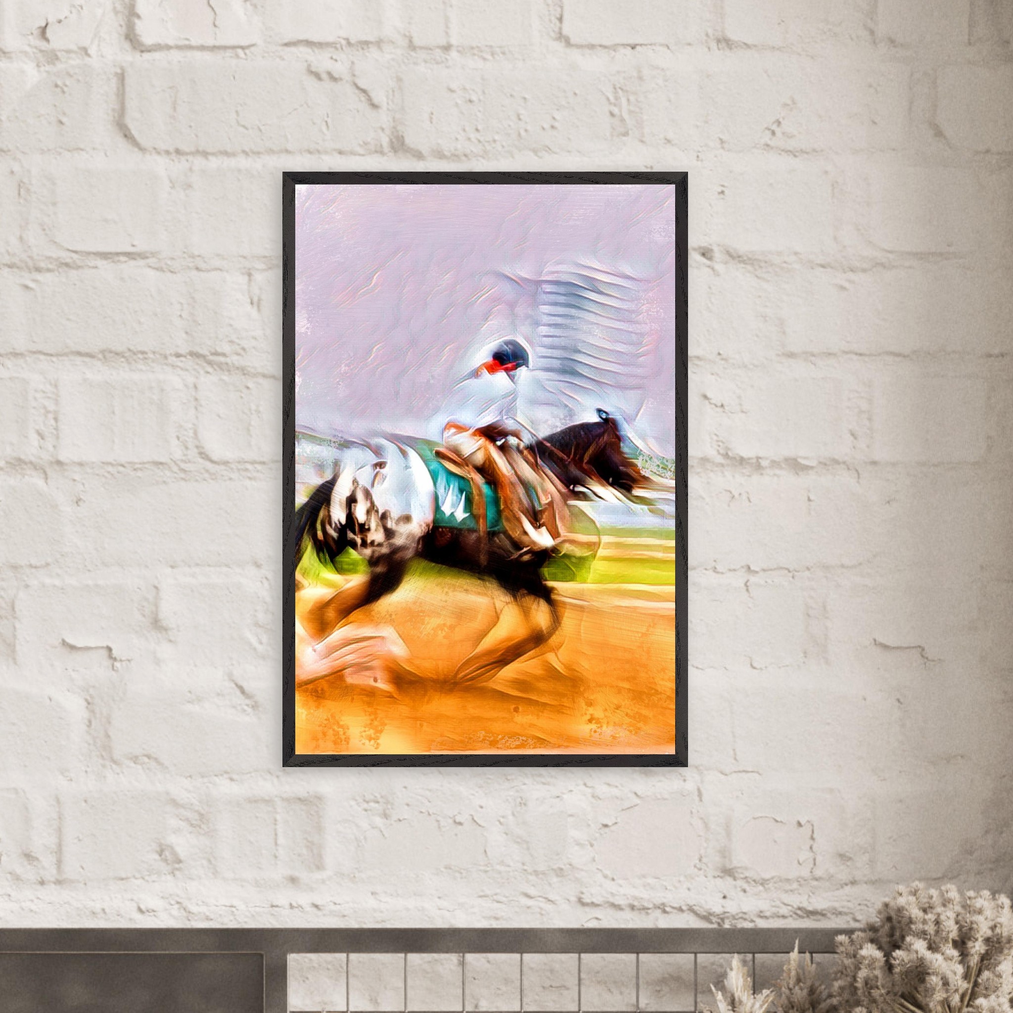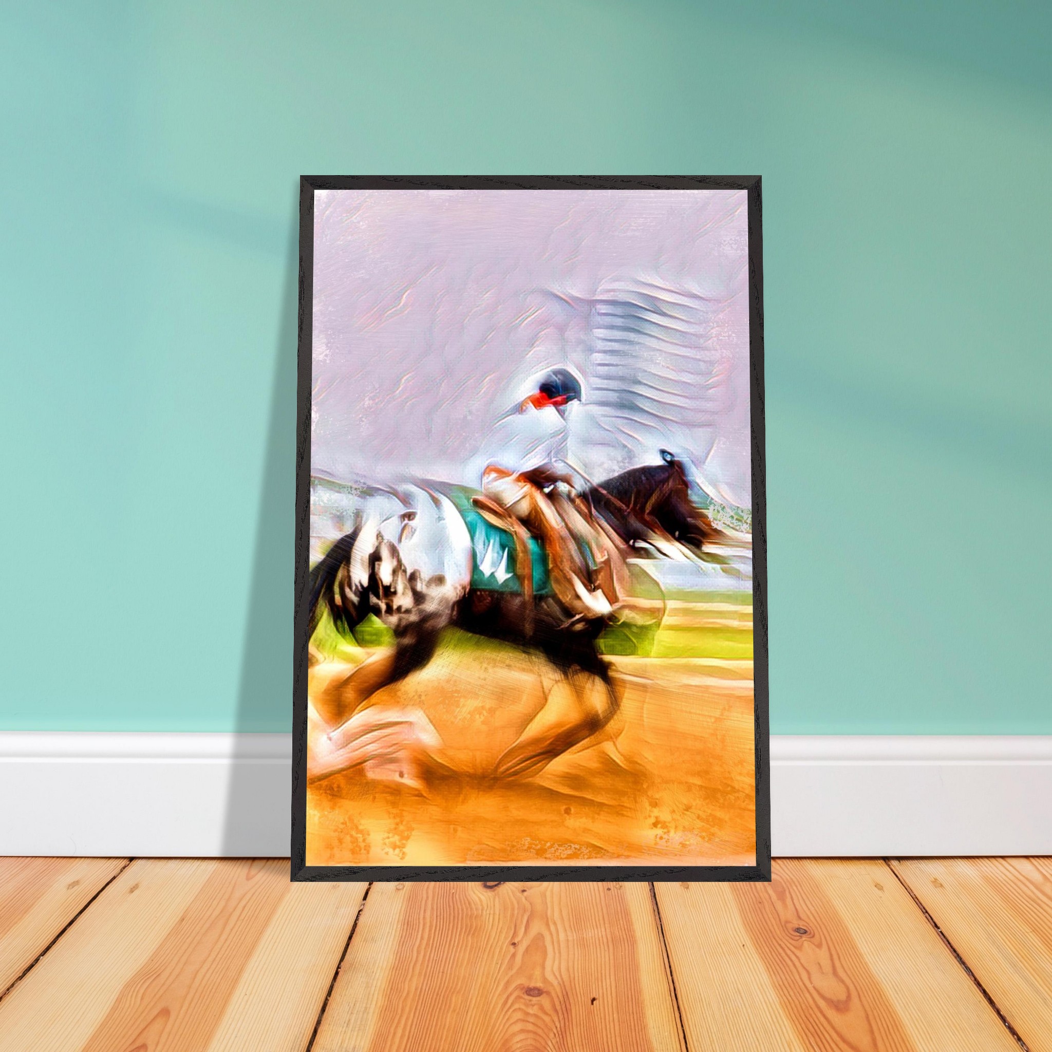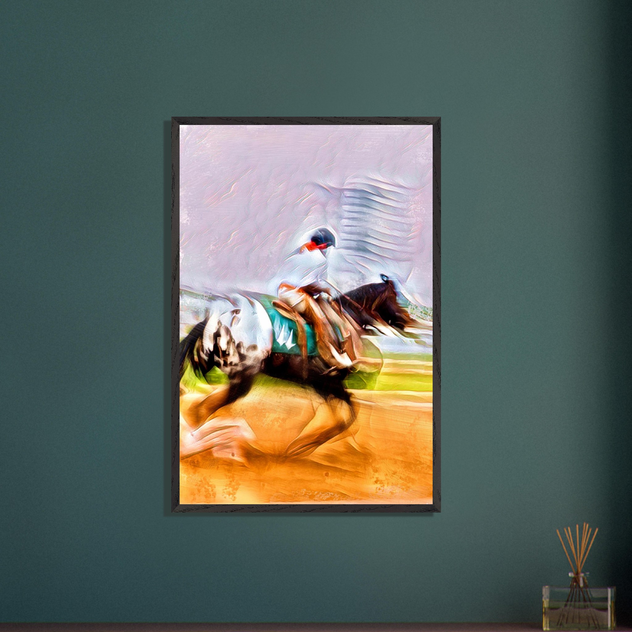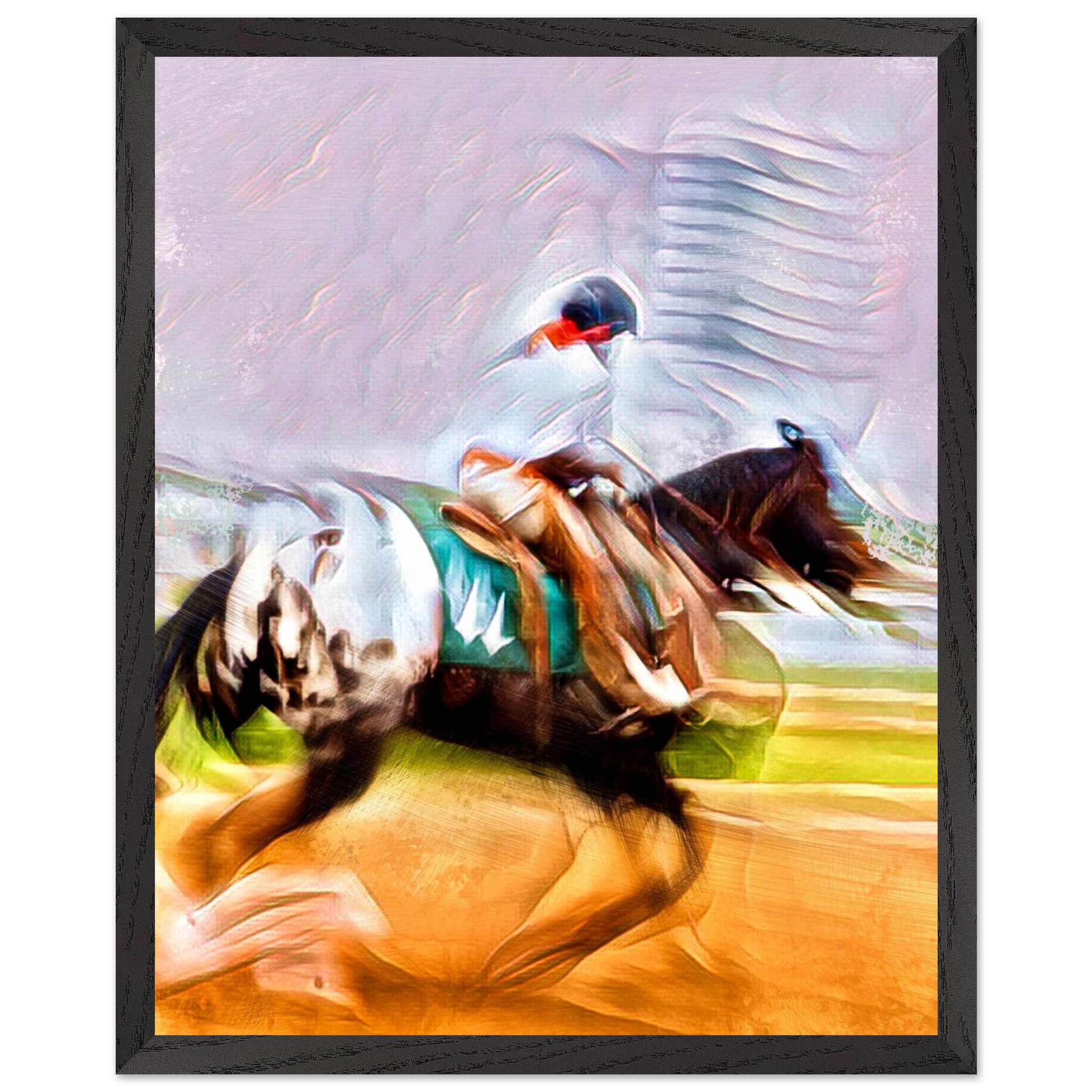 Rider features an impressionistic look of a high-energy close-up that focuses on the intensity of the jockey and the powerful muscularity of the horse in full stride. Brilliant colors and a vibrant palette.